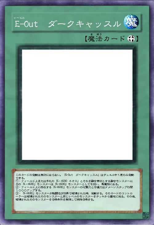 | このカードの発動は無効にならない。「E-Out ダークキャッスル」はデュエル中1度のみ発動できる。 ①:フィールド上または手札の「E・HERO ネオス」とそれを融合素材とする融合モンスター以外の「E・HERO」モンスターは「E-HERO」モンスターとしても扱い、悪魔族になる。 ②:フィールド上に存在する「E-HERO」モンスターの攻撃力と守備力はダメージステップの間1000アップする。 ③:「E-HERO」モンスターが戦闘及び効果で破壊された時、発動する。そのカードのコントローラーは破壊されたそのモンスターと同じレベルのモンスターをデッキから墓地に送る。その後、破壊されたそのモンスターを召喚条件を無視して特殊召喚する。 | |||
