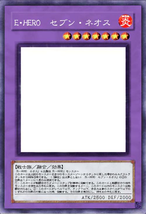 | 「E・HERO ネオス」+炎属性「E・HERO」モンスター このカードは上記のモンスターを自分のモンスターゾーンからデッキに戻した場合のみエクストラデッキから特殊召喚できる。(「融合」は必要としない)「E・HERO セブン・ネオス」の②の効果は1ターンに1度のみ使用できる。 ①:このカードが戦闘を行うダメージステップ計算時に発動できる。このカードと戦闘を行う相手モンスターを持ち主の手札に戻す。この効果を発動するターン、このカード以外のモンスターは戦闘を行えない。②:このカードがレベル7以下、ランク7以下、赤または青のスケールが7以下のいずれかの効果の対象になった時、発動する。その効果を無効にし、持ち主の手札に戻す。 | |||