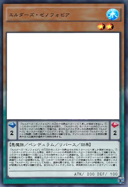 | 「エルダーズ・ゼノフォビア」の②のP効果は1ターンに1度しか使用できない。①:このカードがPゾーンに存在する限り、「エルダーズ」モンスター以外のフィールドのモンスターの攻撃力・守備力は、自分のエクストラデッキの表側表示の「エルダーズ」モンスターの数×100ダウンする。②:自分フィールドの「エルダーズ」カードが戦闘・効果で破壊された場合に発動できる。Pゾーンのこのカードを表側攻撃表示または裏側守備表示で特殊召喚する。 | |||