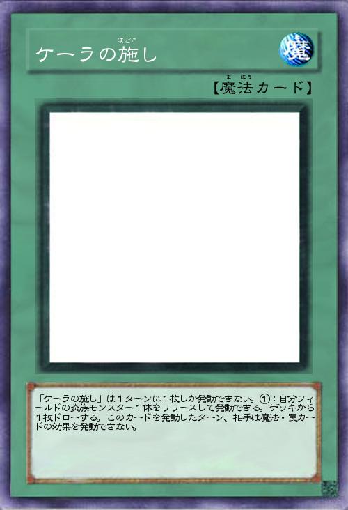 | 「ケーラの施し」は1ターンに1枚しか発動できない。①:自分フィールドの「ケーラ」モンスター1体をリリースして発動できる。デッキから1枚ドローする。このカードを発動したターン、相手は魔法・罠カードの効果を発動できない。 | |||