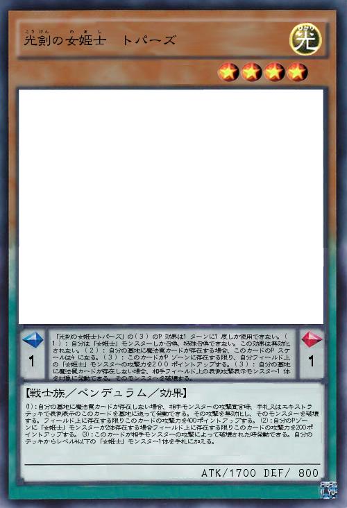 | 「光剣の女姫士トパーズ」の(3)のP効果は1ターンに1度しか使用できない。(1):自分は「女姫士」モンスターしか召喚、特殊召喚できない。この効果は無効化されない。(2):自分の墓地に魔法罠カードが存在する場合、このカードのPスケールは4になる。(3):このカードがPゾーンに存在する限り、自分フィールド上の「女姫士」モンスターの攻撃力を200ポイントアップする。(3):自分の墓地に魔法罠カードが存在しない場合、相手フィールド上の表側攻撃表示モンスター1体を対象に発動できる。そのモンスターを破壊する。 | |||