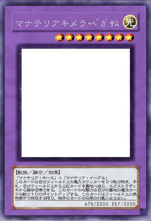 | 「マナテリア・ホース」+「マナテリア・イーグル」 このカードは自分フィールド上の魔力カウンターを2つ取り除き、手札・自分フィールド上から上記カードを墓地へ送り、エクストラデッキから融合召喚できる。このカードの攻撃力は自分の墓地の魔法カードの数×100ポイントアップする。このカードはフィールド上に表側表示で存在する限り、相手のカードの効果の対象にならない。 | |||