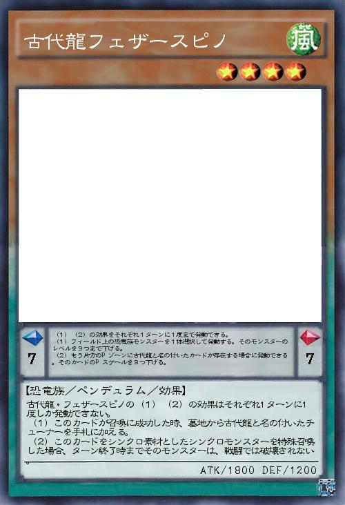 | 古代龍・フェザースピノの(1)(2)の効果はそれぞれ1ターンに1度しか発動できない。 (1)このカードが召喚に成功した時、墓地から古代龍と名の付いたチューナーを手札に加える。 (2)このカードをシンクロ素材としたシンクロモンスターを特殊召喚した場合、ターン終了時までそのモンスターは、戦闘では破壊されない。 | |||