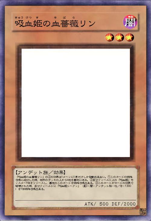 | 「吸血姫の血薔薇リン」の②の効果は1ターンに1度だけしか発動出来ない。①このカードの特殊召喚に成功した時、相手のデッキの上から4枚を墓地に送る。②自分フィールド上の「吸血姫」モンスター1体をリリースし、墓地のこのカードを特殊召喚出来る。③このカードがカードの効果で破壊された時、自分フィールドに「吸血姫トークン」(星3・闇・アンデット族・攻/守・1300)を1体特殊召喚出来る。 | |||