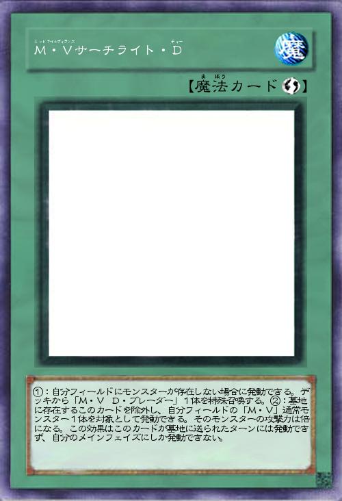| ①:自分フィールドにモンスターが存在しない場合に発動できる。デッキから「M・V D・ブレーダー」1体を特殊召喚する。②:墓地に存在するこのカードを除外し、自分フィールドの「M・V」通常モンスター1体を対象として発動できる。そのモンスターの攻撃力は倍になる。この効果はこのカードが墓地に送られたターンには発動できず、自分のメインフェイズにしか発動できない。 | |||