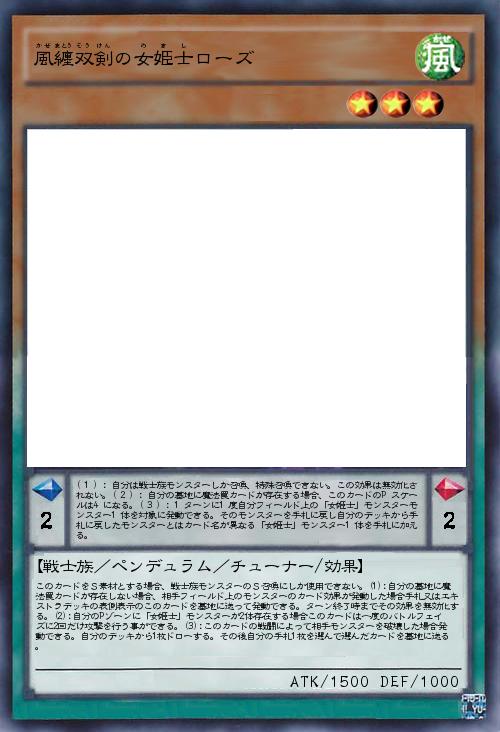| このカードをS素材とする場合、戦士族モンスターのS召喚にしか使用できない。(1):自分の墓地に魔法罠カードが存在しない場合、相手フィールド上のモンスターのカード効果が発動した場合手札又はエキストラデッキの表側表示のこのカードを墓地に送って発動できる。ターン終了時までその効果を無効化する。(2):自分のPゾーンに「女姫士」モンスターが2体存在する場合このカードは一度のバトルフェイズに2回だけ攻撃を行う事ができる。(3):このカードの戦闘によって相手モンスターを破壊した場合発動できる。自分のデッキから1枚ドローする。その後自分の手札1枚を選んで選んだカードを墓地に送る。 | |||