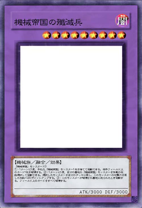| 「機械帝国」モンスター×3 ①:1ターンに1度、手札の「機械帝国」モンスター1枚を捨てて発動できる。相手フィールド上のカード1枚を破壊する。②:1ターンに1度、自分の墓地の「機械帝国」モンスターを任意の枚数選択して発動できる。選択したモンスターを自分のデッキに戻し、このモンスターの攻撃力を戻した枚数×200ポイントアップする。③:このモンスターが破壊され墓地に送られたとき発動する。フィールド上のカードをすべて破壊する。 | |||