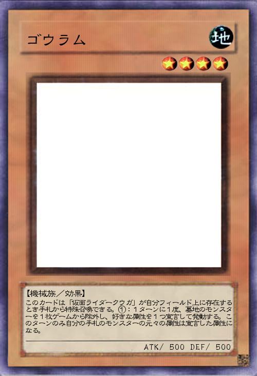 | このカードは「仮面ライダークウガ」が自分フィールド上に存在するとき手札から特殊召喚できる。①:1ターンに1度、墓地のモンスターを1枚ゲームから除外し、好きな属性を1つ宣言して発動する。このターンのみ自分の手札のモンスターの元々の属性は宣言した属性になる。 | |||