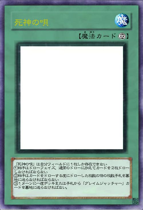 | 「死神の唄」は自分フィールドに1枚しか存在できない ①相手はドローフェイズ、通常のドローに加えてカードを2枚ドローしなければならない ②相手はカードをドローする度にドローした枚数の倍の枚数手札を墓地に送らなければならない ③1ターンに一度デッキまたは手札から「グレイムジャッチャー」カードを墓地に送らなければない。 | |||
