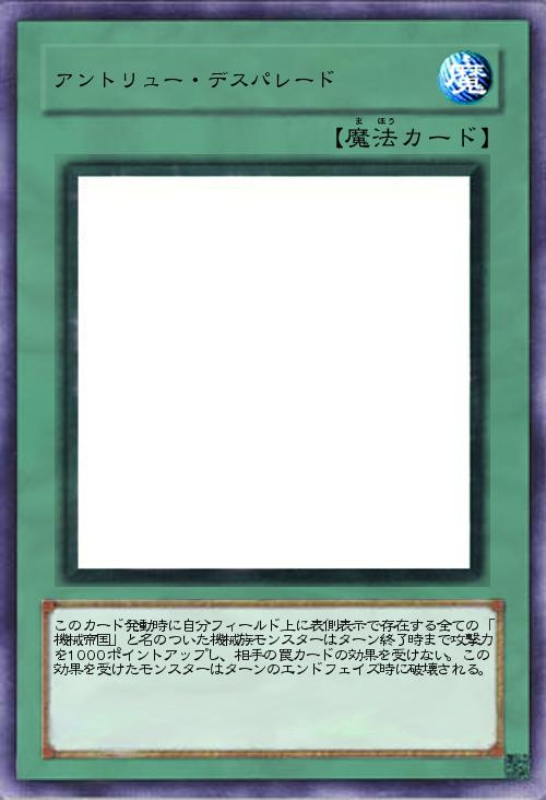 | このカード発動時に自分フィールド上に表側表示で存在する全ての「機械帝国」と名のついた機械族モンスターはターン終了時まで攻撃力を1000ポイントアップし、相手の罠カードの効果を受けない。この効果を受けたモンスターはターンのエンドフェイズ時に破壊される。 | |||
