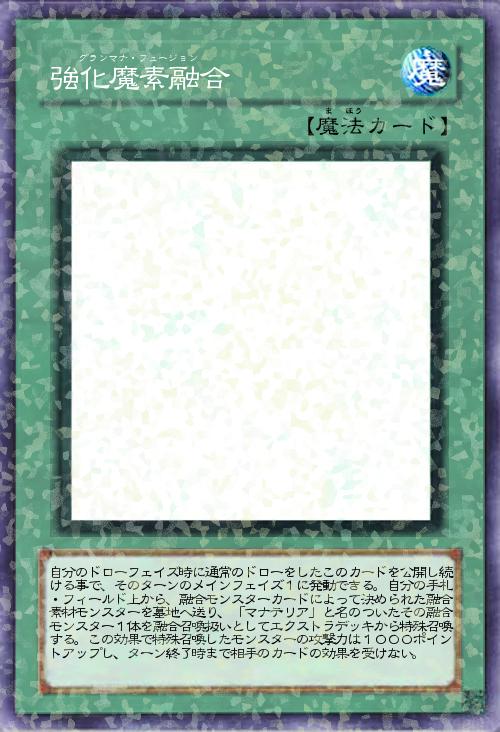 「七皇の剣っぽい融合カード。融合方法としては普通の融合と何ら変わりないが、モンスターの攻撃を増強させ、さらに1ターン完全な耐性を与えるすんごいおまけつき。メインフェイズ1開始時に使う必要はないので、小回りも効きやすく非常に強力。