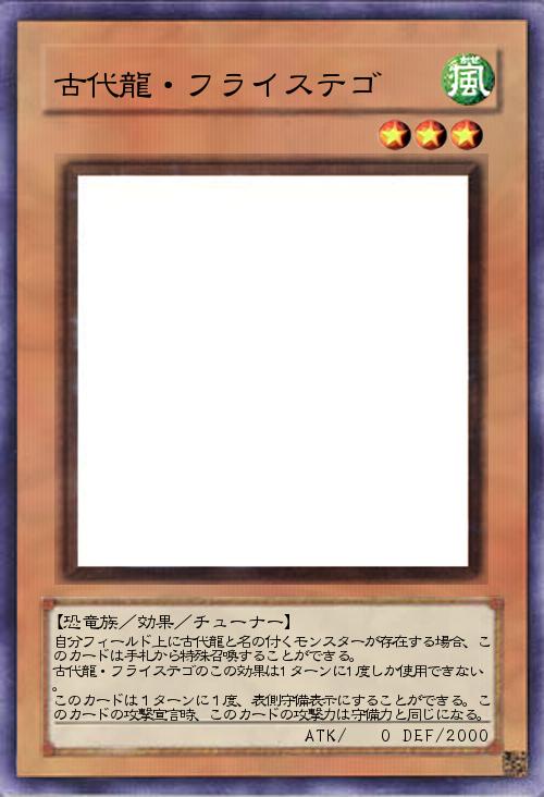 | 自分フィールド上に古代龍と名の付くモンスターが存在する場合、このカードは手札から特殊召喚することができる。 古代龍・フライステゴのこの効果は1ターンに1度しか使用できない。 このカードは1ターンに1度、表側守備表示にすることができる。このカードの攻撃宣言時、このカードの攻撃力は守備力と同じになる。 | |||