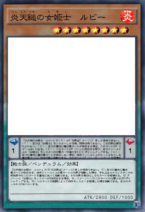 | 「炎天槌の女姫士 ルビー」の(4)のP効果は1ターンに1度しか使用できない。(1):自分は「女姫士」モンスターしか召喚、特殊召喚できない。この効果は無効化されない。(2):自分の墓地に魔法罠カードが存在する場合、このカードのPスケールは4になる。(3):このカードがPゾーンに存在する限り、自分フィールド上の「女姫士」モンスターの攻撃力・守備力を300ポイントアップする。(4):自分の墓地に魔法罠カードが存在しない場合、相手フィールド上のセットされている魔法罠カード1枚を対象に発動できる。そのカードとPゾーンのこのカードを破壊する。 | |||