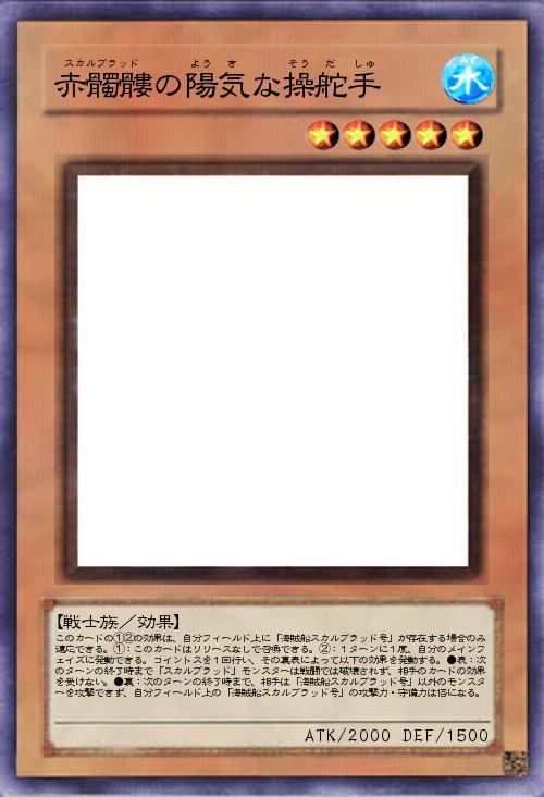 | このカードの①②の効果は、自分フィールド上に「海賊船スカルブラッド号」が存在する場合のみ適応できる。①:このカードはリリースなしで召喚できる。②:1ターンに1度、自分のメインフェイズに発動できる。コイントスを1回行い、その裏表によって以下の効果を発動する。●表:次のターンの終了時まで「スカルブラッド」モンスターは戦闘では破壊されず、相手のカードの効果を受けない。●裏:次のターンの終了時まで、相手は「海賊船スカルブラッド号」以外のモンスターを攻撃できず、自分フィールド上の「海賊船スカルブラッド号」の攻撃力・守備力は倍になる。 | |||