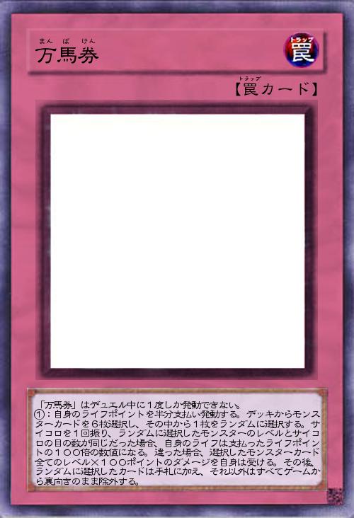| 「万馬券」はデュエル中に1度しか発動できない。 ①:自身のライフポイントを半分支払い発動する。デッキからモンスターカードを6枚選択し、その中から1枚をランダムに選択する。サイコロを1回振り、ランダムに選択したモンスターのレベルとサイコロの目の数が同じだった場合、自身のライフは支払ったライフポイントの100倍の数値になる。違った場合、選択したモンスターカード全てのレベル×100ポイントのダメージを自身は受ける。その後、ランダムに選択したカードは手札に加え、それ以外はすべてゲームから裏向きのまま除外する。 | |||