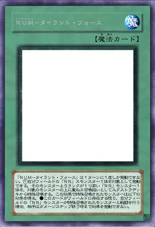 | 「RUM-タイラント・フォース」は1ターンに1度しか発動できない。①自分フィールドの「RR」Xモンスター1体を対象として発動できる。そのモンスターよりランクが1つ高い「RR」モンスター1体を、対象のモンスターの上に重ねX召喚扱いとしてエクストラデッキから特殊召喚する。この効果で特殊召喚されたモンスターは以下の効果を得る。●このカードがフィールドに存在する限り、自分フィールドの「RR」モンスターが特殊召喚されたモンスターと戦闘を行う場合、相手はダメージステップ終了時まで効果を発動できない。 | |||
