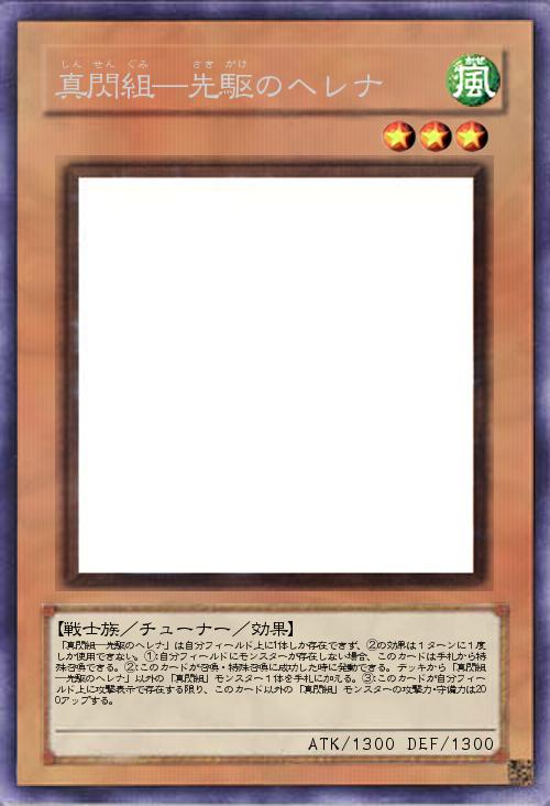 | 「真閃組―先駆のヘレナ」は自分フィールド上に1体しか存在できず、②の効果は1ターンに1度しか使用できない。①:自分フィールドにモンスターが存在しない場合、このカードは手札から特殊召喚できる。②:このカードが召喚・特殊召喚に成功した時に発動できる。デッキから「真閃組―先駆のヘレナ」以外の「真閃組」モンスター1体を手札に加える。③:このカードが自分フィールド上に攻撃表示で存在する限り、このカード以外の「真閃組」モンスターの攻撃力・守備力は200アップする。 | |||