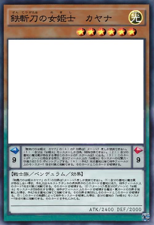 | 「斬鉄刀の女姫士 カヤナ」の(4)のP効果は1ターンに1度しか使用できない。(1):自分は「女姫士」モンスターしか召喚、特殊召喚できない。(2):自分の墓地に魔法罠が存在する場合このカードのPスケールは5になる。(3):このカードがPゾーンに存在する限り、自分フィールド上の「女姫士」モンスターの攻撃力・守備力を200ポイントアップする。(4):手札1枚を墓地に捨て相手フィールド上のモンスター1体を対象に発動できる。そのカードとこのカードを破壊する。 | |||