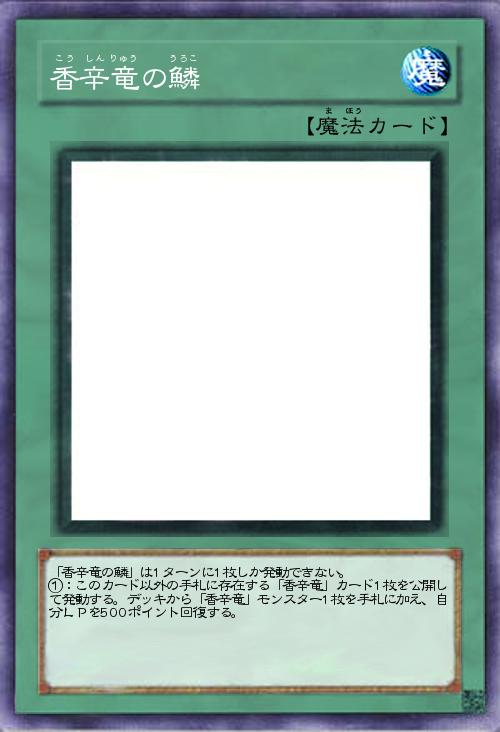 | 「香辛竜の鱗」は1ターンに1枚しか発動できない。 ①:このカード以外の手札に存在する「香辛竜」カード1枚を公開して発動する。デッキから「香辛竜」モンスター1枚を手札に加え、自分LPを500ポイント回復する。 | |||