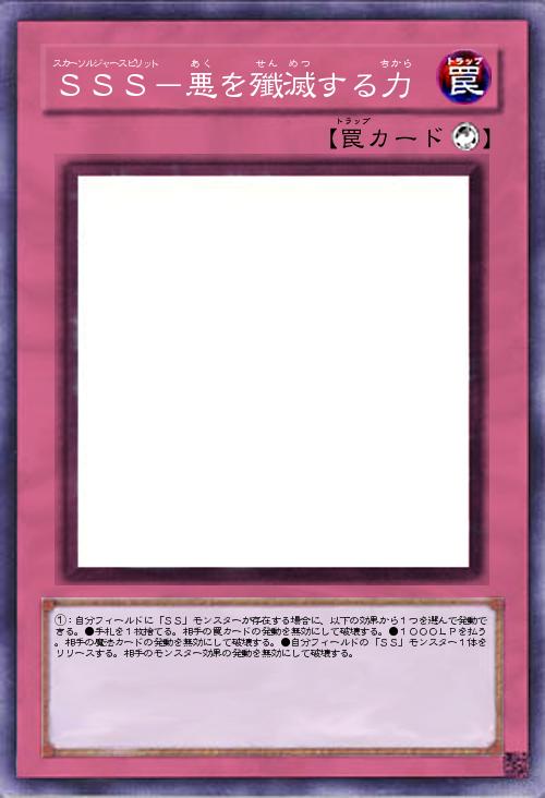 | ①:自分フィールドに「SS」モンスターが存在する場合に、以下の効果から1つを選んで発動できる。●手札を1枚捨てる。相手の罠カードの発動を無効にして破壊する。●1000LPを払う。相手の魔法カードの発動を無効にして破壊する。●自分フィールドの「SS」モンスター1体をリリースする。相手のモンスター効果の発動を無効にして破壊する。 | |||