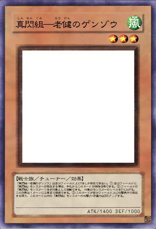 | 「真閃組―老健のゲンゾウ」は自分フィールド上に1体しか存在できない。①:自分フィールドに「真閃組」モンスターが存在する場合、手札からこのカードを特殊召喚できる。②:フィールドの「真閃組」モンスター1体を対象として発動できる。 対象のモンスターのレベルを3つ上げる。この効果は1ターンに2度まで使用できる。③:このカードが自分フィールド上に攻撃表示で存在する限り、このカード以外の「真閃組」モンスターの攻撃力・守備力は200アップする。 | |||