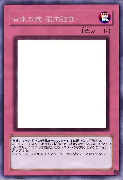 | 自分フィールド上の恐竜族モンスターを1体選択して発動する。 選択したモンスターよりも攻撃力が低い表側表示モンスターを全てリリースし、1体につき選択したモンスターの攻撃力は300ポイントアップする。 このターン、選択したモンスターでしか攻撃することができない。 | |||
