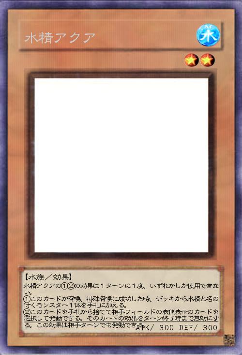 | 水精アクアの①②の効果は1ターンに1度、いずれかしか使用できない。 ①このカードが召喚、特殊召喚に成功した時、デッキから水精と名の付くモンスター1体を手札に加える。 ②このカードを手札から捨てて相手フィールドの表側表示のカードを選択して発動できる。そのカードの効果をターン終了時まで無効にする。この効果は相手ターンでも発動できる。 | |||