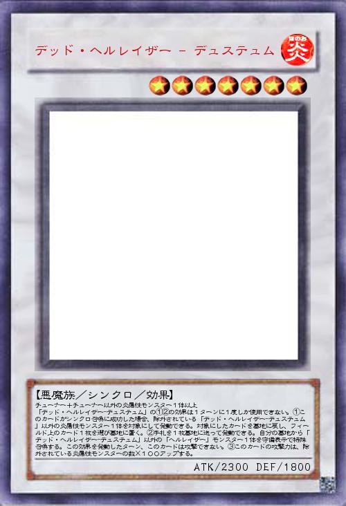 | チューナー+チューナー以外の炎属性モンスター1体以上 「デッド・ヘルレイザー-デュステュム」の①②の効果は1ターンに1度しか使用できない。①このカードがシンクロ召喚に成功した場合に発動できる。除外されている「デッド・ヘルレイザー-デュステュム」以外の炎属性モンスター1体を墓地に戻し、フィールド上のカード1枚を選び墓地に置く。②手札を1枚墓地に送って発動できる。自分の墓地から「デッド・ヘルレイザー-デュステュム」以外の「ヘルレイザー」モンスター1体を守備表示で特殊召喚する。この効果を発動したターン、このカードは攻撃できない。③このカードの攻撃力は、除外されている炎属性モンスターの数×100アップする。 | |||
