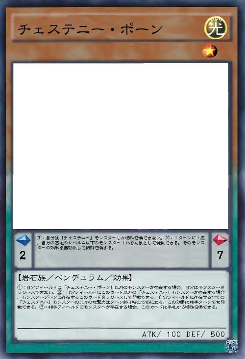 | ①:自分フィールドに「チェステニー・ポーン」以外のモンスターが存在する場合、自分はモンスターをリリースできない。②:自分フィールドにこのカード以外の「チェステニー」モンスターが存在する場合、モンスターゾーンに存在するこのカードをリリースして発動できる。自分フィールドに存在する全ての「チェステニー」モンスターの元々の攻撃力はターン終了時まで倍になる。この効果は相手ターンでも発動できる。③:相手フィールドにモンスターが存在する場合、このカードは手札から特殊召喚できる。 | |||