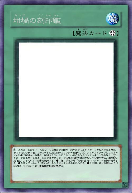 | ①:このカードがフィールドゾーンに存在する限り、相手のデッキからカードが除外される度に、その1枚につき1個、このカードの上に刻印カウンターを置く。②:フィールドゾーンのこのカードが効果で破壊される場合、破壊する代わりにこのカードの刻印カウンターを1つ取り除く。③:1ターンに1度、このカードの刻印カウンターを任意の個数だけ取り除いて発動できる。取り除いた個数によって以下の効果を適用する。●1個:手札から「刻印蛇」モンスター1体を特殊召喚する。●3個:デッキから「刻印蛇」モンスター1体を手札に加える。●10個:自分の墓地から「刻印蛇」モンスターを可能な限り特殊召喚する。 | |||