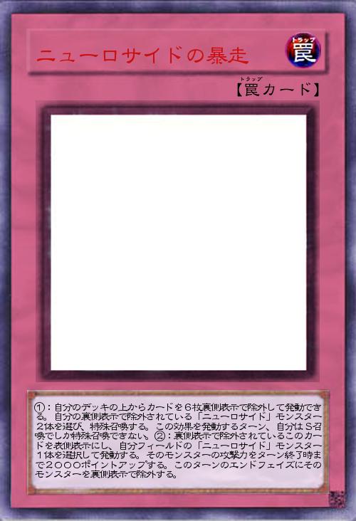 | ①:自分のデッキの上からカードを6枚裏側表示で除外して発動できる。自分の裏側表示で除外されている「ニューロサイド」モンスター2体を選び、特殊召喚する。この効果を発動するターン、自分はS召喚でしか特殊召喚できない。②:裏側表示で除外されているこのカードを表側表示にし、自分フィールドの「ニューロサイド」モンスター1体を選択して発動する。そのモンスターの攻撃力をターン終了時まで2000ポイントアップする。このターンのエンドフェイズにそのモンスターを裏側表示で除外する。 | |||
