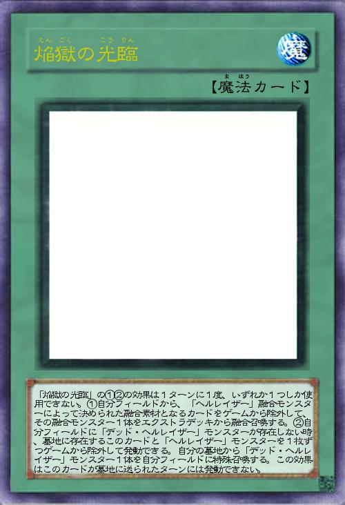 | 「焔獄の光臨」の①②の効果は1ターンに1度、いずれか1つしか使用できない。①自分フィールドから、「ヘルレイザー」融合モンスターによって決められた融合素材となるカードをゲームから除外して、その融合モンスター1体をエクストラデッキから融合召喚する。②自分フィールドに「デッド・ヘルレイザー」モンスターが存在しない時、墓地に存在するこのカードと「ヘルレイザー」モンスターを1枚ずつゲームから除外して発動できる。自分の墓地から「デッド・ヘルレイザー」モンスター1体を自分フィールドに特殊召喚する。この効果はこのカードが墓地に送られたターンには発動できない。 | |||
