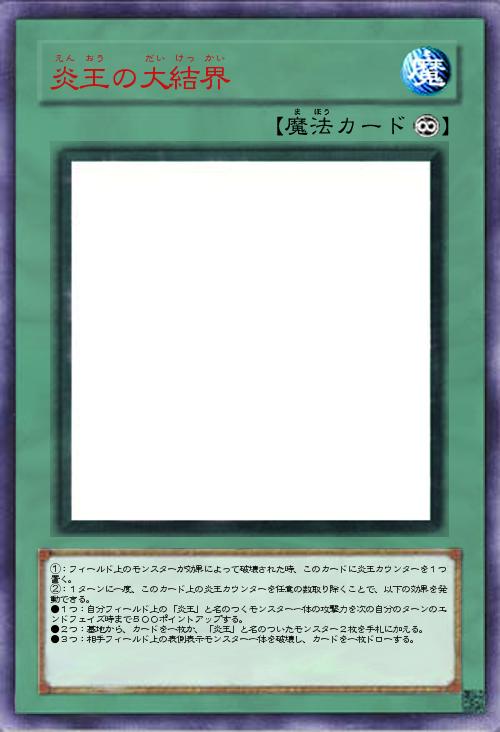 | ①:フィールド上のモンスターが効果によって破壊された時、このカードにフレアカウンターを1つ置く。 ②:1ターンに一度、このカード上のフレアカウンターを任意の数取り除くことで、以下の効果を発動できる。 ●1つ:自分フィールド上の「炎王」と名のつくモンスター一体の攻撃力をこのターンのエンドフェイズ時まで500ポイントアップする。 ●2つ:墓地から、カードを一枚か、「炎王」と名のついたモンスター2枚を手札に加える。 ●3つ:相手フィールド上の表側表示モンスター一体を破壊し、カードを一枚ドローする。 | |||