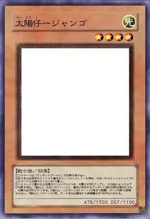 | ①このカードは「アンデッドワールド」の効果を受けない。 ②自分または相手がフィールド魔法をコントロールしている場合、お互いのスタンバイフェイズにこのカードに太陽カウンターを1つ置く。 ③このカードに置かれた太陽カウンター1つにつき、攻撃力が300アップし、その数によって以下の効果を得る。1個以上:お互いのフィールド、墓地に存在するアンデット族の効果は無効化され、攻撃力は1000ダウンする。2個以上:このカードは1ターンに2度まで戦闘、カード効果で破壊されない。3個以上:1ターンに1度、デッキまたは墓地から装備魔法を1枚手札に加える。 | |||