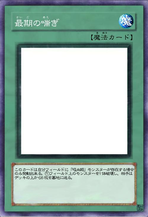 | このカードは自分フィールドに「吸血姫」モンスターが存在する場合のみ発動出来る。①フィールド上のモンスターを1体破壊し、相手はデッキの上から5枚を墓地に送る。 | |||