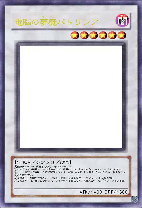 | 悪魔族チューナー+夢魔と名の付くモンスター1体 ①このカードは戦闘によって破壊されず、戦闘によって発生する自分へのダメージは0になる。 ②カードの効果が発動した時に魅了カウンターがのった相手モンスター1体とこのカードを除外することができる。 ③このカードが除外されたターンのターン終了時にこのカードをフィールド上に戻す。 ④このカードは、相手の除外されているカード1枚につき、攻撃力が100ポイントアップする。 | |||