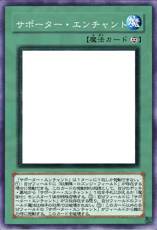 | 「サポーター・エンチャント」は1ターンに1枚しか発動できない。①:自分フィールドに「紋章陣-ロズンジ・フィールド」が存在する場合に発動できる。このカードの発動時の処理として、自分のデッキ・墓地から「サポーター・エンチャント」1枚を手札に加えるか「魔術士」モンスター1体を特殊召喚する。②:自分フィールドに「サポーター・エンチャント」が2枚存在する限り、自分フィールドのフィールド魔法は相手の効果では破壊されない。③:このカード以外の自分フィールドの「サポーター・エンチャント」がフィールドから離れた時に発動する。このカードを破壊する。 | |||