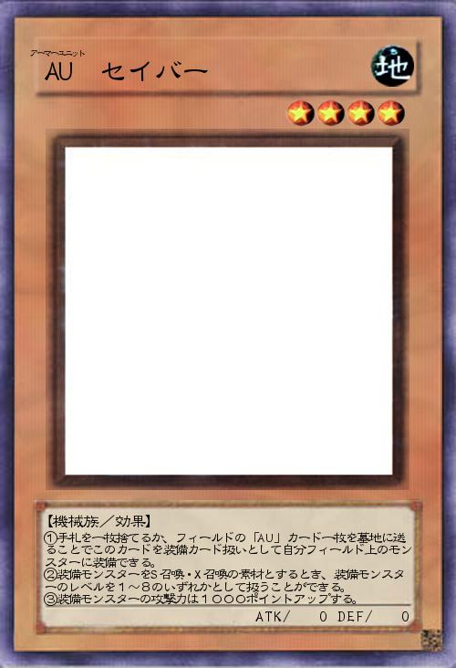 | ①手札を一枚捨てるか、フィールドの「AU」カード一枚を墓地に送ることでこのカードを装備カード扱いとして自分フィールド上のモンスターに装備できる。 ②装備モンスターをS召喚・X召喚の素材とするとき、装備モンスターのレベルを1~8のいずれかとして扱うことができる。 ③装備モンスターの攻撃力は1000ポイントアップする。 | |||