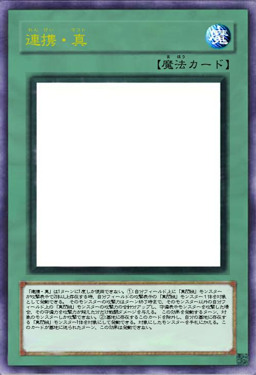 | 「連携・真」は1ターンに1度しか使用できない。①:自分フィールド上に「真閃組」モンスターが攻撃表示で2体以上存在する時、自分フィールドの攻撃表示の「真閃組」モンスター1体を対象として発動できる。 そのモンスターの攻撃力はターン終了時まで、そのモンスター以外の自分フィールド上の「真閃組」モンスターの攻撃力の合計分アップし、守備表示モンスターを攻撃した場合、その守備力を攻撃力が超えた分だけ戦闘ダメージを与える。 この効果を発動するターン、対象のモンスターしか攻撃できない。②:墓地に存在するこのカードを除外し、自分の墓地に存在する「真閃組」モンスター1体を対象にして発動できる。対象にしたモンスターを手札に加える。このカードが墓地に送られたターン、この効果は発動できない。 | |||