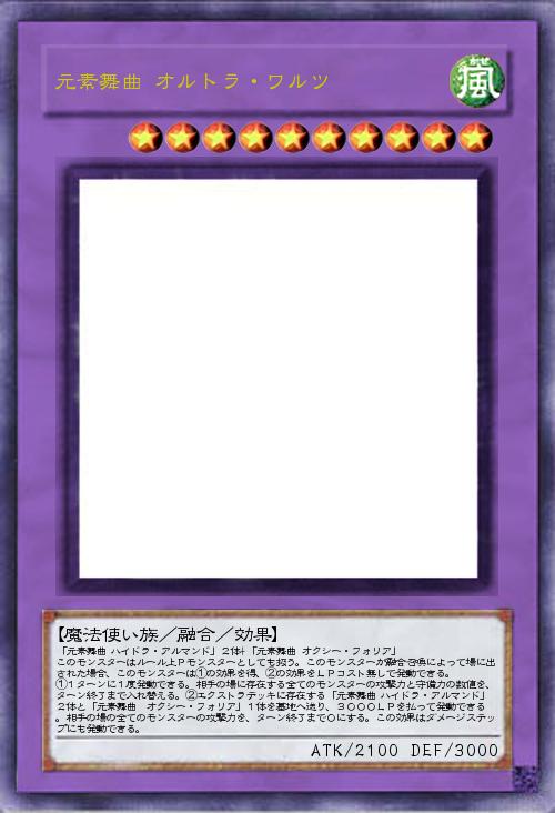 | 「元素舞曲 ハイドラ・アルマンド」2体+「元素舞曲 オクシー・フォリア」 このモンスターはルール上Pモンスターとしても扱う。このモンスターが融合召喚によって場に出された場合、このモンスターは①の効果を得、②の効果をLPコスト無しで発動できる。 ①1ターンに1度発動できる。相手の場に存在する全てのモンスターの攻撃力と守備力の数値を、ターン終了まで入れ替える。②エクストラデッキに存在する「元素舞曲 ハイドラ・アルマンド」2体と「元素舞曲 オクシー・フォリア」1体を墓地へ送り、3000LPを払って発動できる。相手の場の全てのモンスターの攻撃力を、ターン終了まで0にする。この効果はダメージステップにも発動できる。 | |||