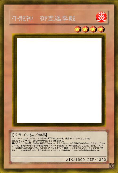 | このカードはライフポイントが自分の1000ではない時、通常モンスターとして扱う 自分のライフポイントが1000の場合以下の効果を得る。 ●このカードの攻撃、効果は無効にできない。またこのカードの召喚に成功成功したとき、デッキ、手札、墓地からそれぞれ「千龍神」モンスターを召喚する(特殊召喚としても扱う)また、このカードが墓地に送られたとき、エクストラデッキから「千龍神」シンクロモンスターをシンクロ召喚扱いとして特殊召喚する。また相手のバトルフェイズ時墓地のこのカードを特殊召喚できる。 | |||