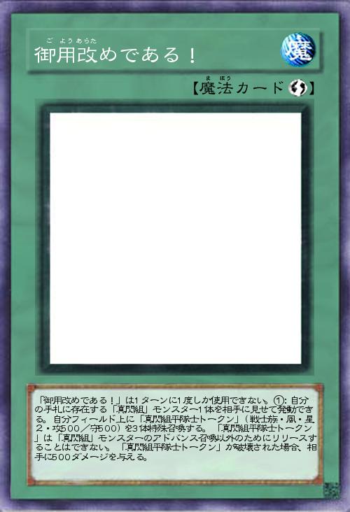 | 「御用改めである!」は1ターンに1度しか使用できない。①:自分の手札に存在する「真閃組」モンスター1体を相手に見せて発動できる。自分フィールド上に「真閃組平隊士トークン」(戦士族・風・星2・攻500/守500)を3体特殊召喚する。「真閃組平隊士トークン」は「真閃組」モンスターのアドバンス召喚以外のためにリリースすることはできない。「真閃組平隊士トークン」が破壊された場合、相手に500ダメージを与える。 | |||