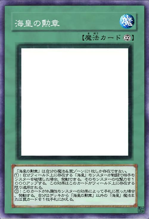 | 「海皇の勲章」は自分の魔法&罠ゾーンに1枚しか存在できない。 ①:自分フィールド上に存在する「海皇」モンスターが戦闘で相手モンスターを破壊した場合、発動できる。そのモンスターの攻撃力を1000アップする。この効果はこのカードがフィールド上に存在する限り適用される。 ②:このカードが水属性モンスターの効果によって手札に戻った場合、発動する。自分はデッキから「海皇の勲章」以外の「海皇」魔法または罠カードを1枚手札に加える。 | |||