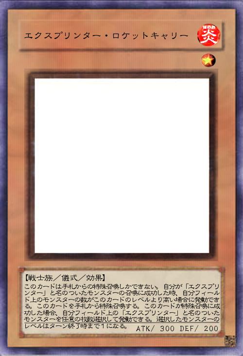 | このカードは手札からの特殊召喚しかできない。自分が「エクスプリンター」と名のついたモンスターの召喚に成功した時、自分フィールド上のモンスターの数がこのカードのレベルより高い場合に発動できる。このカードを手札から特殊召喚する。このカードが特殊召喚に成功した場合、自分フィールド上の「エクスプリンター」と名のついたモンスターを任意の枚数選択して発動できる。選択したモンスターのレベルはターン終了時まで1になる。 | |||