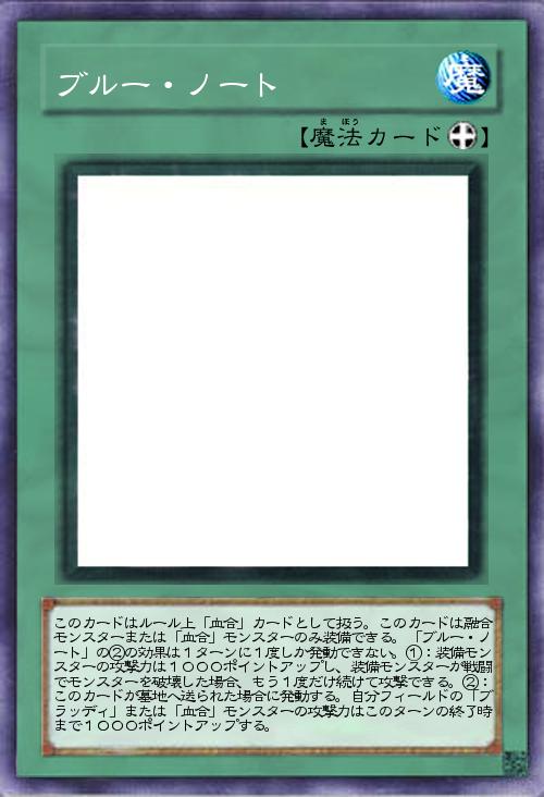 | このカードはルール上「血合」カードとして扱う。このカードは融合モンスターまたは「血合」モンスターのみ装備できる。「ブルー・ノート」の②の効果は1ターンに1度しか発動できない。①:装備モンスターの攻撃力は1000ポイントアップし、装備モンスターが戦闘でモンスターを破壊した場合、もう1度だけ続けて攻撃できる。②:このカードが墓地へ送られた場合に発動する。自分フィールドの「ブラッディ」または「血合」モンスターの攻撃力はこのターンの終了時まで1000ポイントアップする。 | |||
