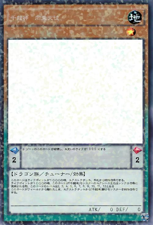 | このカードはライフポイントが1000の時、エクストラデッキ、手札から特殊召喚できる。 ライフポイントが1000の時、このカードが「千龍神」モンスターのエクシーズまたはシンクロ召喚に使用される際、このカードのレベルは2、3、4、5、6、7、8、9、10、11、12となる このカードがフィールドから離れたとき、エクストラデッキから「千龍神」融合モンスターを特殊召喚できる。 | |||