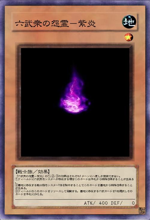 | 「六武衆の怨霊-紫炎」の①.②.③の効果はそれぞれ1ターンに一度しか使用できない。 ①フィールドに六武衆モンスターが存在する場合このカードは手札から特殊召喚することが出来る。 ②墓地に存在する戦士族モンスター1体を除外することでこのカードを墓地から特殊召喚することが出来る。 ③フィールドのこのカードをリリースして発動する。墓地に存在する六武カードを1枚選択しそのカードを手札に加える。 | |||