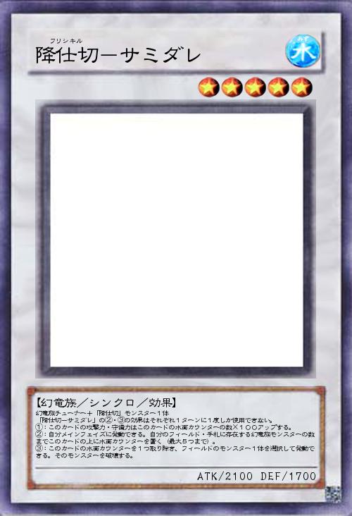 | 幻竜族チューナー+「降仕切」モンスター1体 「降仕切-サミダレ」の②・③の効果はそれぞれ1ターンに1度しか使用できない。 ①:このカードの攻撃力・守備力はこのカードの水面カウンターの数×100アップする。 ②:自分メインフェイズに発動できる。自分のフィールド・手札に存在する幻竜族モンスターの数までこのカードの上に水面カウンターを置く(最大5つまで)。 ③:このカードの水面カウンターを1つ取り除き、フィールドのモンスター1体を選択して発動できる。そのモンスターを破壊する。 | |||