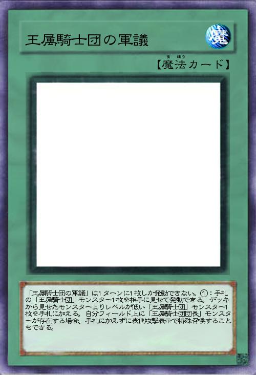 | 「王属騎士団の軍議」は1ターンに1枚しか発動できない。①:手札の「王属騎士団」モンスター1枚を相手に見せて発動できる。デッキから見せたモンスターよりレベルが低い「王属騎士団」モンスター1枚を手札に加える。自分フィールド上に「王属騎士団団長」モンスターが存在する場合、手札に加えずに表側攻撃表示で特殊召喚することもできる。 | |||