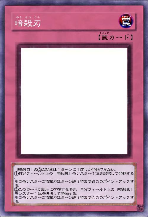 | 「暗殺刃」の②の効果は1ターンに1度しか発動できない。 ①自分フィールド上の「暗殺鬼」モンスター1体を選択して発動する。 そのモンスターの攻撃力はターン終了時まで500ポイントアップする。 ②このカードが墓地に存在する場合、自分フィールド上の「暗殺鬼」モンスター1体を選択して発動する。 そのモンスターの攻撃力はターン終了時まで400ポイントアップする。 | |||